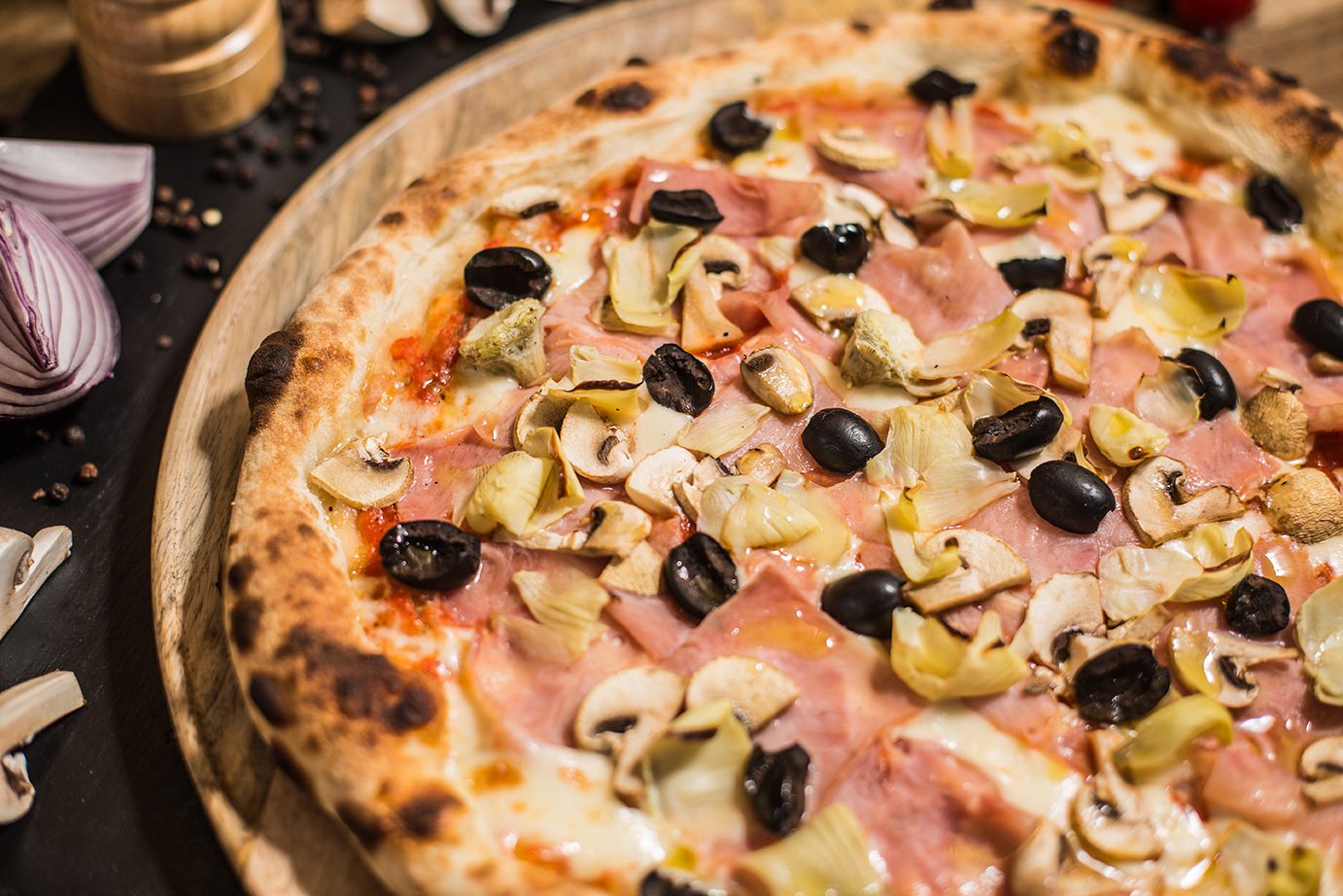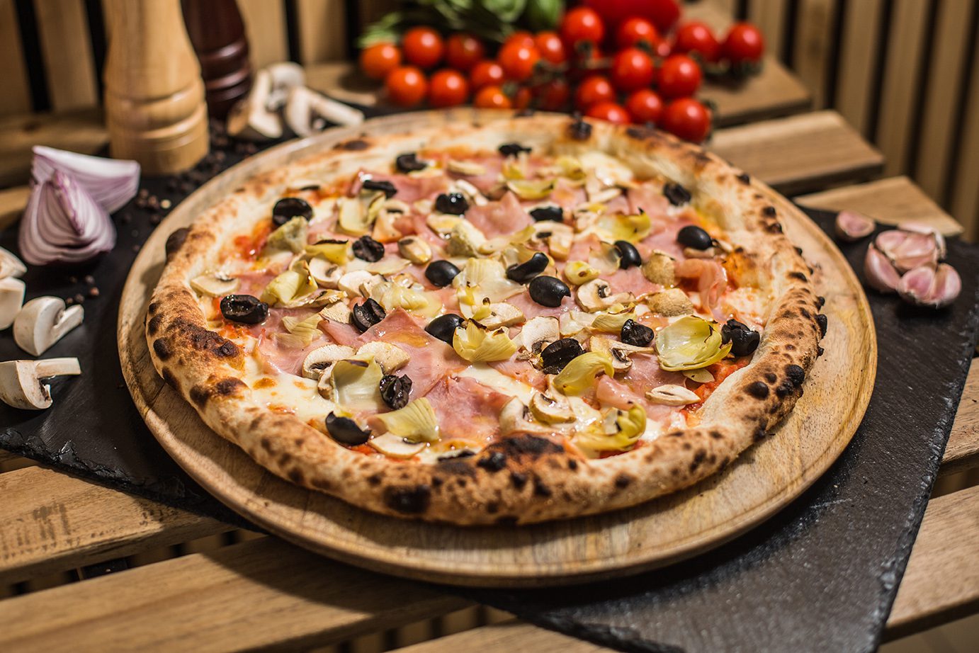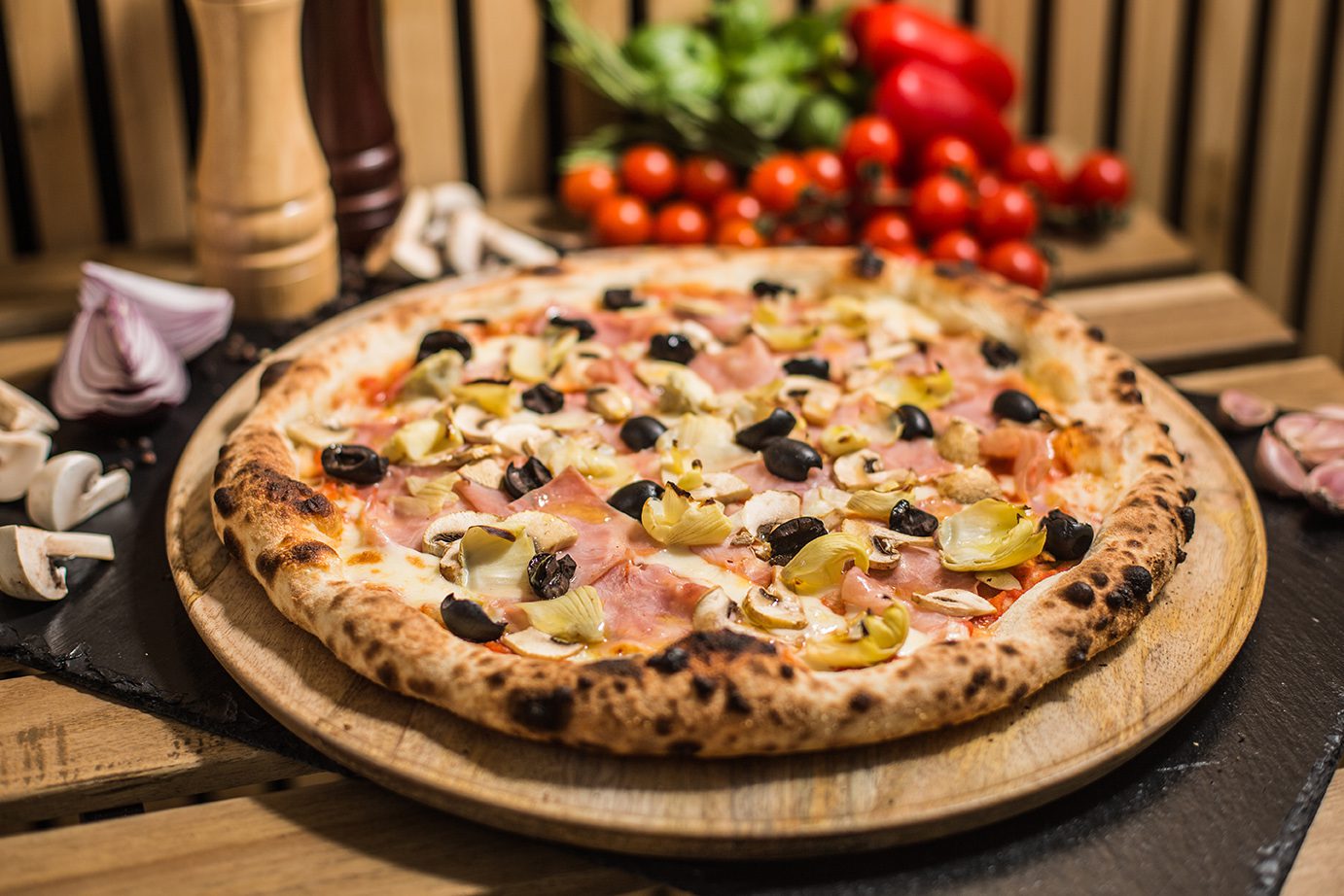 Strona głównaPizza4. Capricciosa 4. Capricciosa 38.00zł Sos pomidorowy, Mozarella, Szynka cotto, Pieczarki, Oliwki czarne, Karczochy Dodatkowy ser Ser Mozarella + 5.00złSer kozi + 5.00złGorgonzola + 5.00złGrana padano + 5.00złMozarella di Bufala + 5.00zł Dodatkowe mięso Salami picante + 6.00złSzynka cotto + 6.00złSzynka parmeńska + 6.00złKurczak + 6.00złSalami z koprem włoskim + 6.00złTuńczyk + 6.00złWędzony łosoś + 6.00zł Dodatkowe warzywa Pieczarki + 4.00złOliwki czarne + 4.00złKarczochy + 4.00złCzerwona cebula + 4.00złPomidorki cherry + 4.00złRucola + 4.00złPieczona papryka + 4.00złChutney z cebuli + 4.00złSuszone pomidory + 4.00złPieczone ziemniaki + 4.00złBorowiki + 4.00złSzpinak + 4.00złCzosnek + 4.00zł ilość 4. Capricciosa Zamów Kategoria: Pizza Product ID: 29201 Opis Opis Sos pomidorowy, Mozarella, Szynka cotto, Pieczarki, Oliwki czarne, Karczochy Podobne produkty 8. Parma Exlusive 44.00zł Zamów 3. Peperoni 36.00zł Zamów 13. Finocchiona 42.00zł Zamów